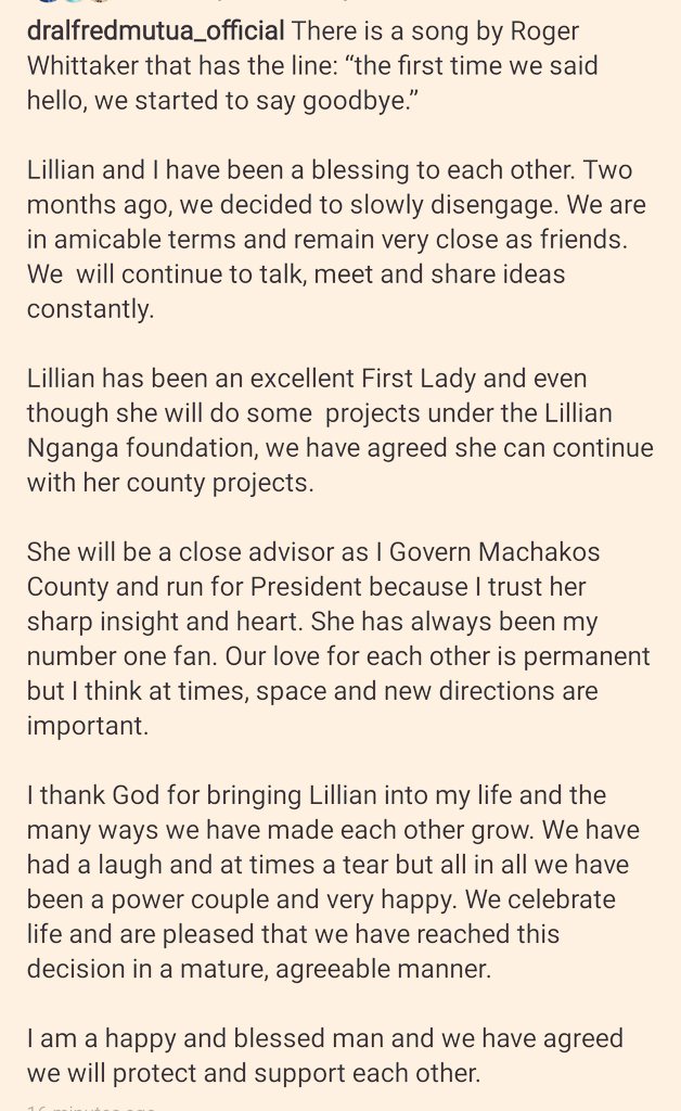 On sunday august 15, machakos first lasy lillian nganga announced her separation from governor alfred.